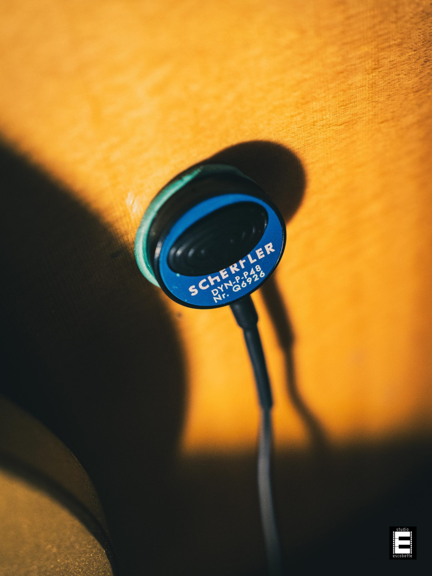 On continue avec un micro de contact, le Schertler Dyn-P-P48, un micro suisse dont la taille est inversement proportionnelle à l’utilité ! Ce modèle est conçu spécifiquement pour le piano, afin de capter les vibrations de la table d’harmonie (soit collé à l’intérieur du piano, soit directement sous la table). L’objectif est de pouvoir récupérer un son dénué de « repisse » lors des prises live. Mixé au son de micros aériens, cela permet de récupérer de l’énergie dans les fréquences qui manquent sans subir la repisse des autres instruments environnants. Le micro se colle à la surface vibrante avec une sorte de pâte à modeler spéciale (« green putty« ).